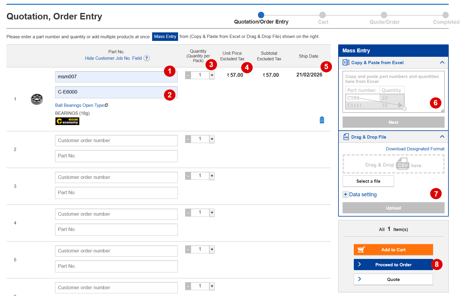 Example format:Part Number Quantity C-E605ZZ 2 C-E6000ZZ 5 C-E6002 3 - 7 Alternatively, drag and drop a CSV file to upload product details. Click to download the CSV format.