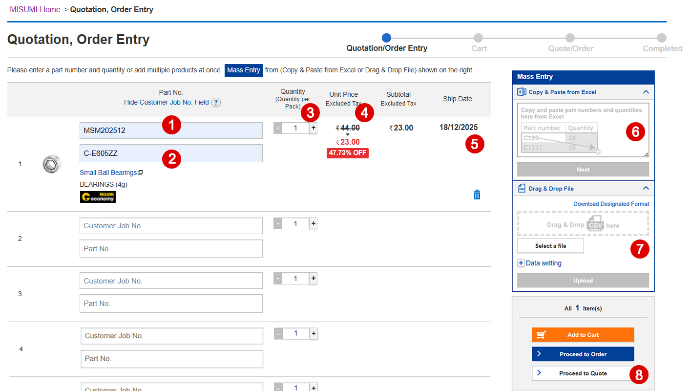 Example format:Part Number Quantity C-E605ZZ 2 C-E6000ZZ 5 C-E6002 3 - 7 Alternatively, drag and drop a CSV file to upload product details. Click to download the CSV format.
