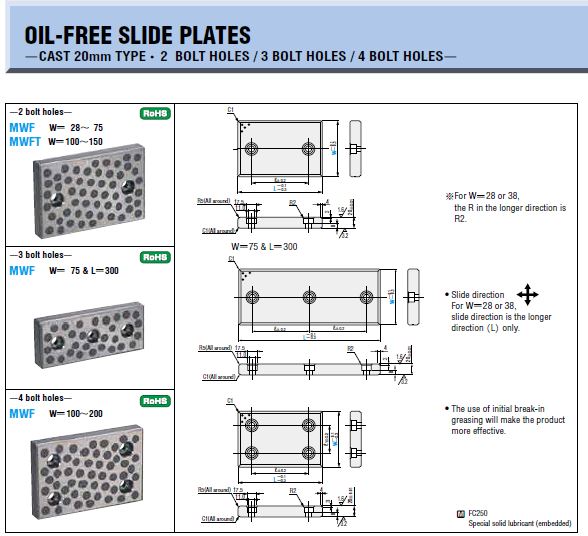 This is a cast iron 20mm type oil-free slide plate. You can choose between 2-hole and 4-hole bolt types. The material is gray cast iron. The ℓ size of MWF75-75 is 25.